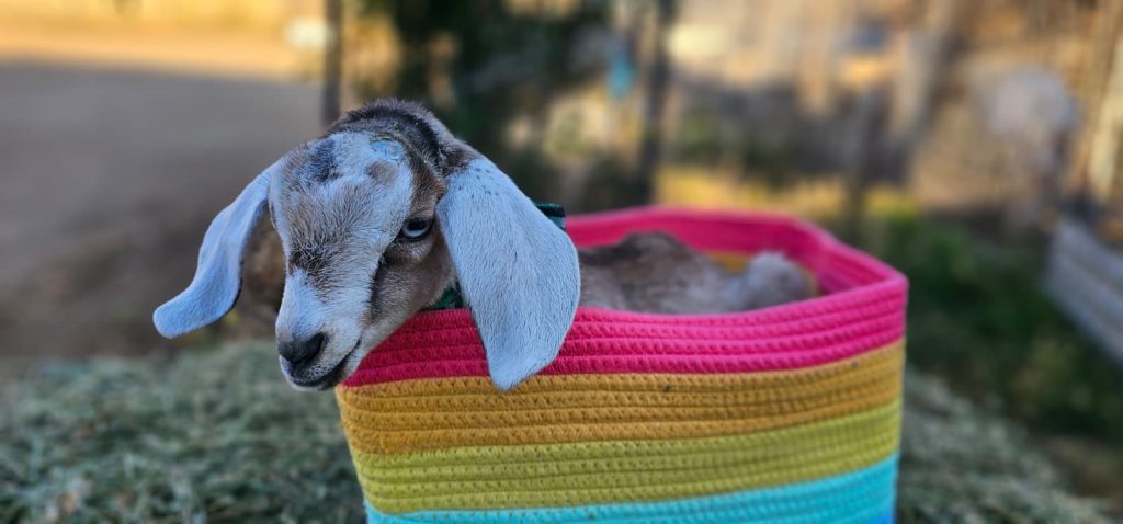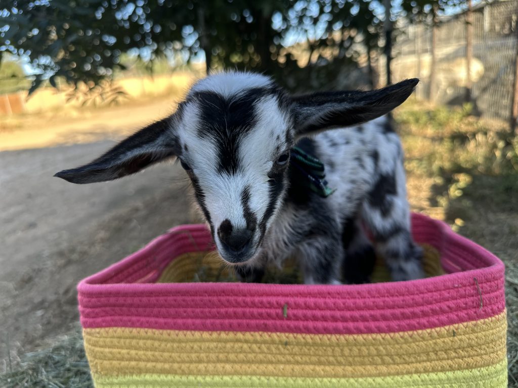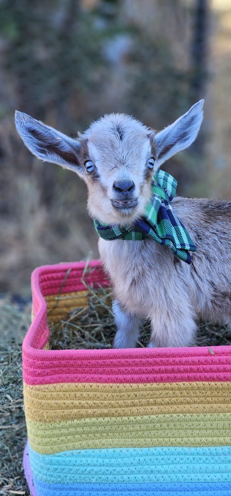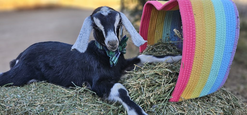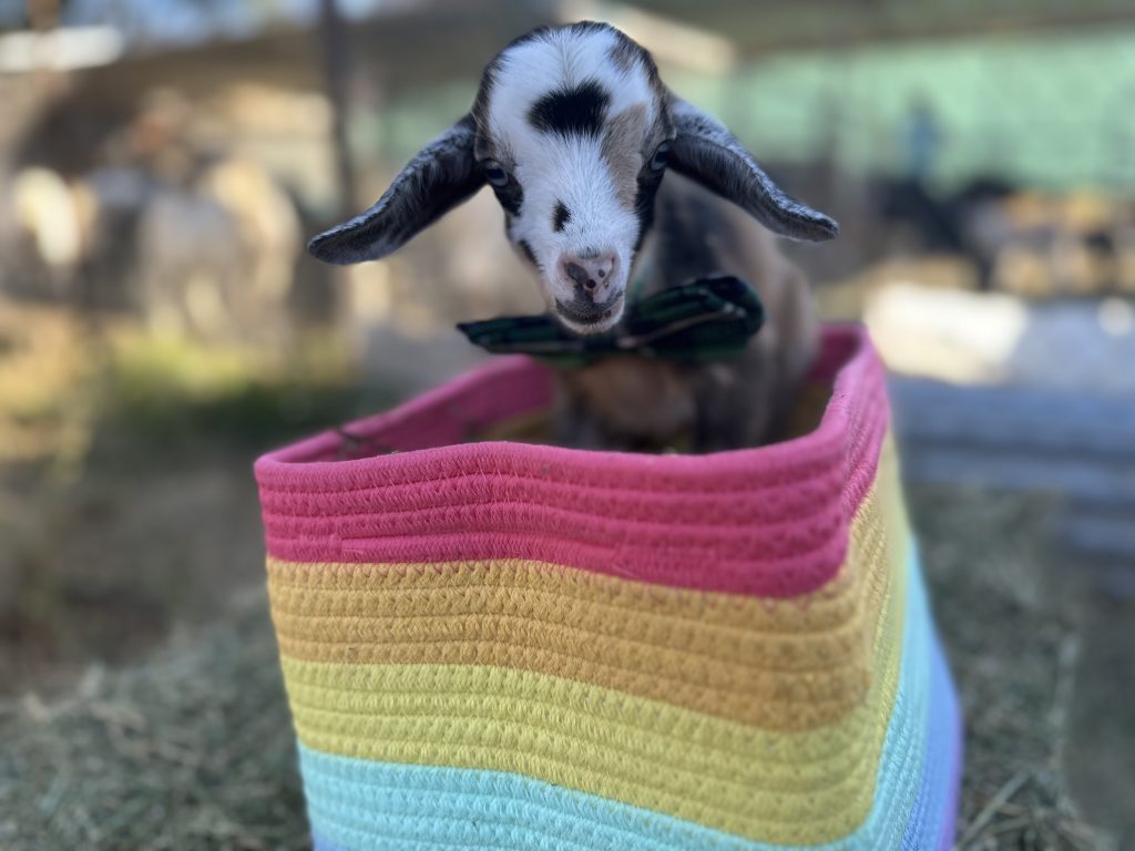 Simon may have been the smallest of Piper’s 2025 set of kids, but his voice was mighty. Known around Rainbow Road Farm for his high-pitched bleats that sounded more like a toddler’s chatter, Simon kept everyone entertained as he trailed behind his siblings, Mosi and Cutie, often ducking under them for comfort. Though a bit runty and endlessly attached to his mama, his heart was full of love and curiosity. Simon now lives at Cheeky Sway Farm, where he’s the cherished companion of a goat named Lily. Farmer Drew says he adjusted beautifully, still chatty, still snuggly, and happier than ever in his new home.