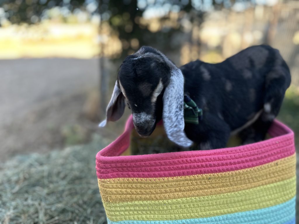 Known as the, “The Shirt Eater,” Pascal graced Rainbow Road Farm when he was just a mere toddler. This Mini Nubian cried multiple nights when he was brought to the farm. However, the tears turned to gleeful bleats and jumps, and runs. He grew used to Rainbow Road Farm, the farmers, and his goat family. Pascal is loved by all who meet him. He is friendly, fun, and he gets himself into a lot of trouble (But hey, don’t all goats do that?). Pascal is the half-brother of Sweetheart, Bumper, and the nephew of Abbey and Piper. On April 18, 2026 Pascal moved over to Beat Feet Stable with Rancher Gretchen. He is loved and spoiled with several other new goat friends and horse friends.